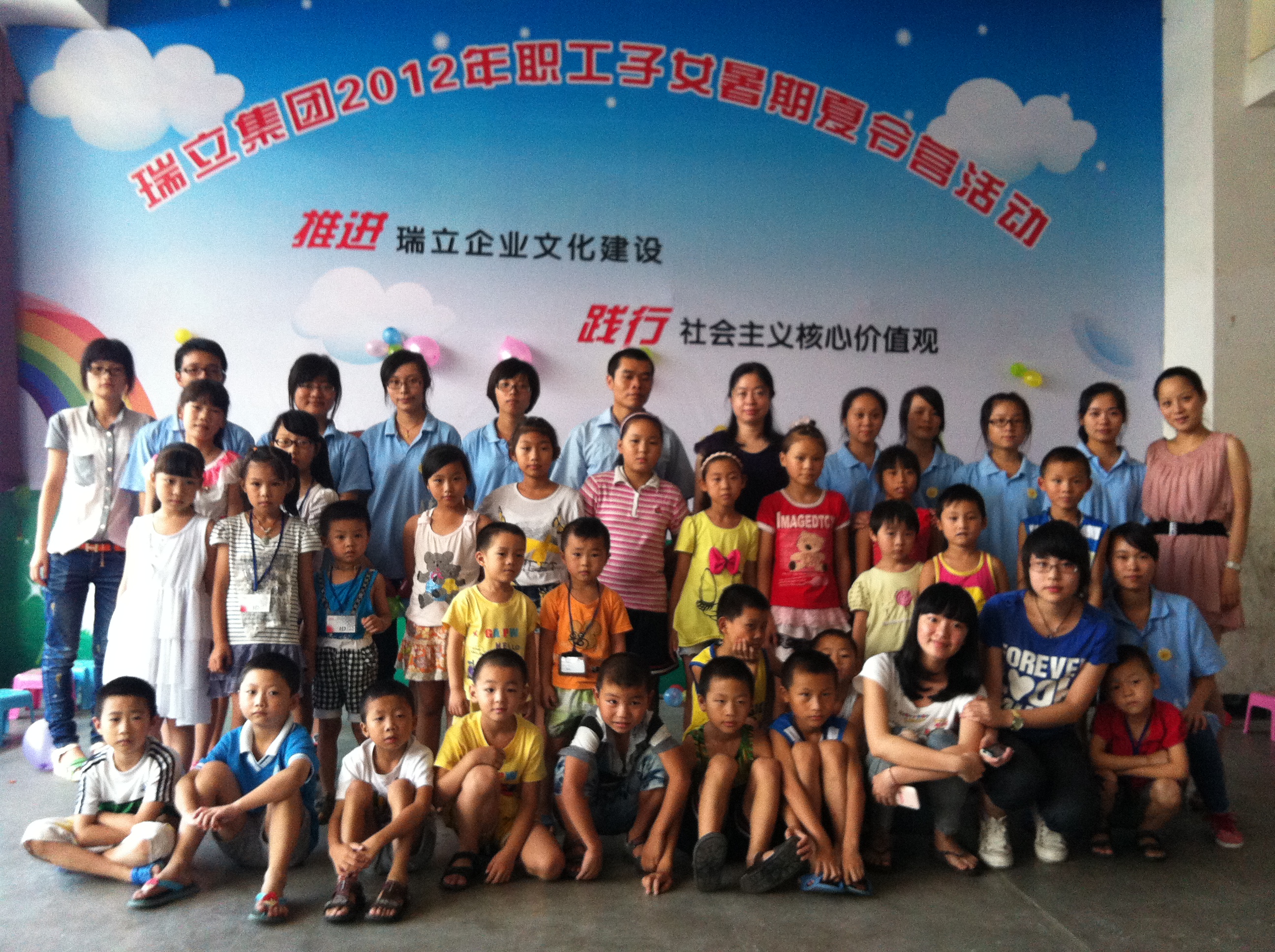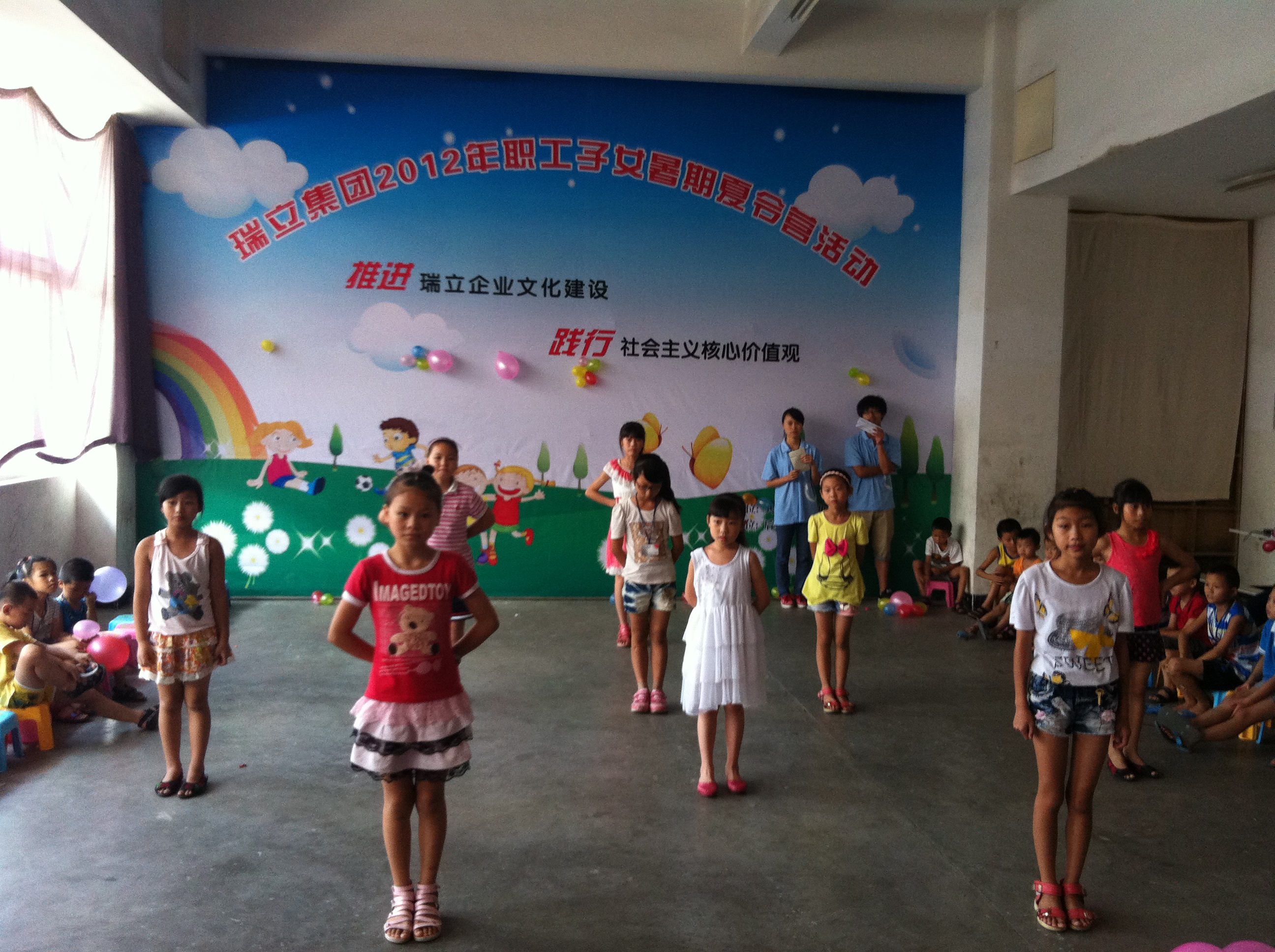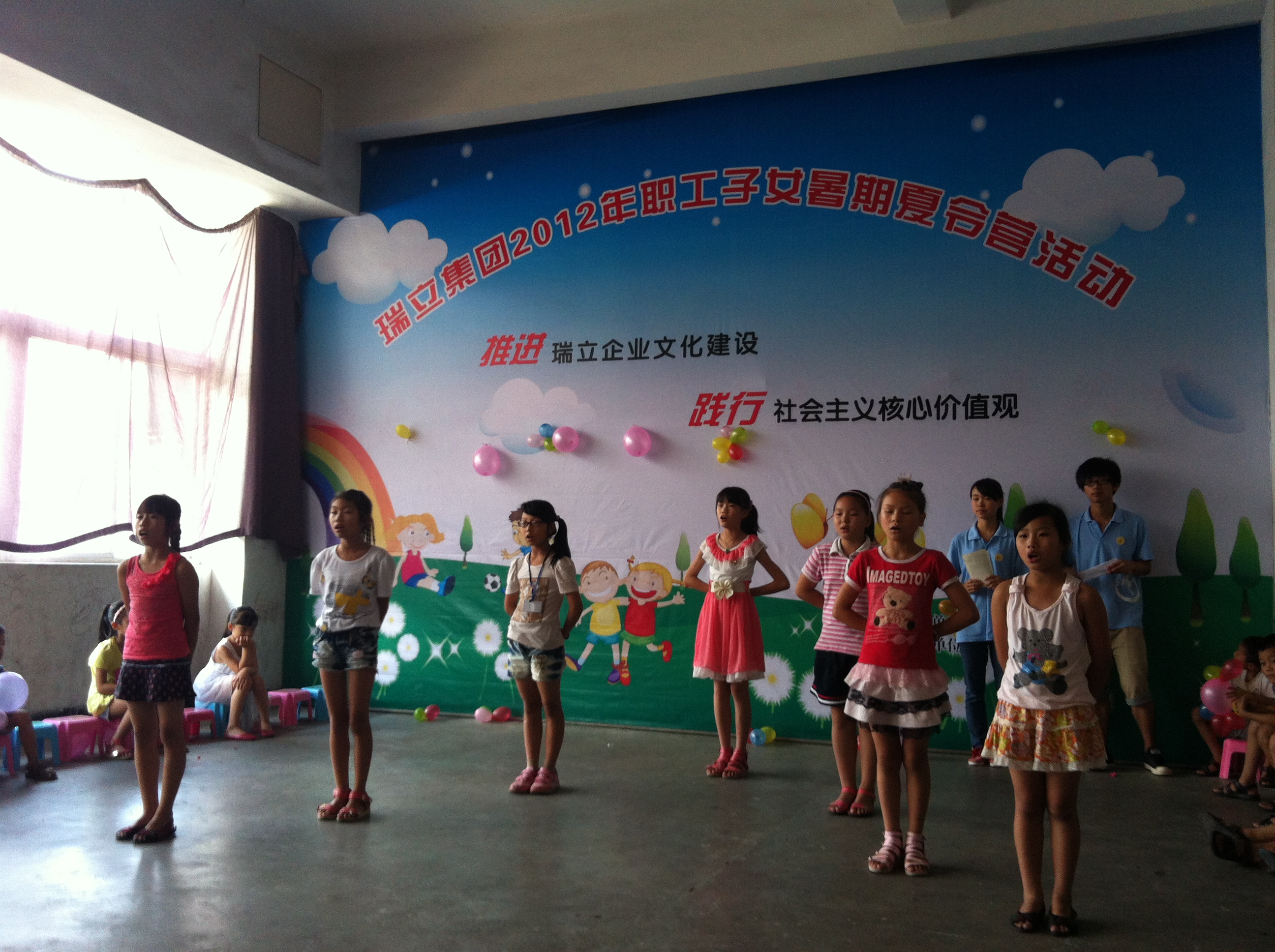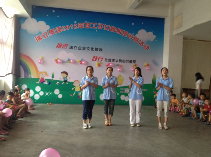 汇报演出在十点一刻正式拉开了序幕,首先由中国瑞立集团后勤主管邹金华发表讲话,他代表瑞立集团对实践队的辛苦付出表示感谢,新温州人子女在他们的带领下懂事不少,感谢实践队员们让瑞立员工可以安心、高效率工作。嵇书记用三个词表达她对实践队成功开展活动的感受:第一个词是“感谢”,她说社会实践是大学生成人的一个教育方式,实践的成功需要得到社会的支持,她感谢瑞立集团以及家长们对“知心姐姐”实践队的支持。第二个词是“祝贺”,她祝贺小朋友们在“知心姐姐”的帮助下丰富了自己的暑期生活,收获知识和乐趣,同时队员们通过实践活动,使自己的专业能力,处事能力,与人相处的能力都得到一定程度的锻炼。第三个词是“祝愿”,她祝愿瑞立企业蓬勃发展,小朋友们快乐健康成长,祝愿我们的队员在学校高效学习和工作,健康生活,都能成为有社会责任感的人民教师。