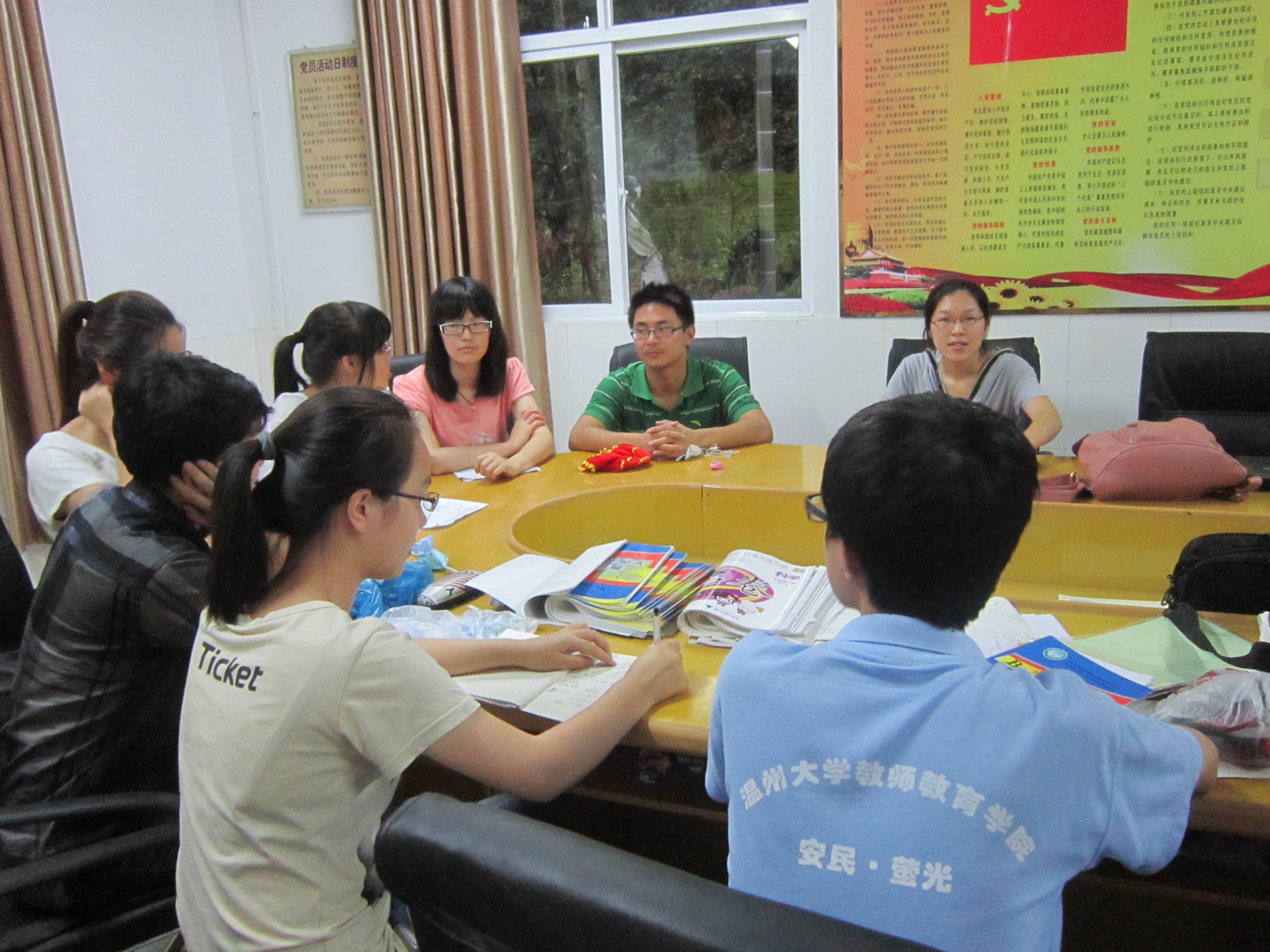 至今为止,为期两个星期的安民支教活动即将落下帷幕,一些后续收尾活动也相继开展。此次汇报演出不同于上一届,可谓多灾多难,由于某些原因,尽管经过我们多方交流,乡政府还是没有和我们合作。所以,舞台的布置、道具的制作、音响的配备等等都需要我们亲历亲为,这将是一个不小的挑战。会议之初,我们就关于成果汇报演出的节目流程、场地问题以及突发状况做了详细的讨论。整个会场气氛非常热烈,队员们踊跃发言,就自己的观点提出种种可用性很强的建议。最后兹定于19日上午9:00在学校操场举行我们万众瞩目的成果汇报演出,这是我们向安民的学生们、乡亲们以及学校的领导展示温大风采的最佳时刻。讨论好了演出,接下来的就是关于停课期间如何安置学生的问题了。经班主任的一致决定,将安排坐班老师在排练期间管理班级纪律。