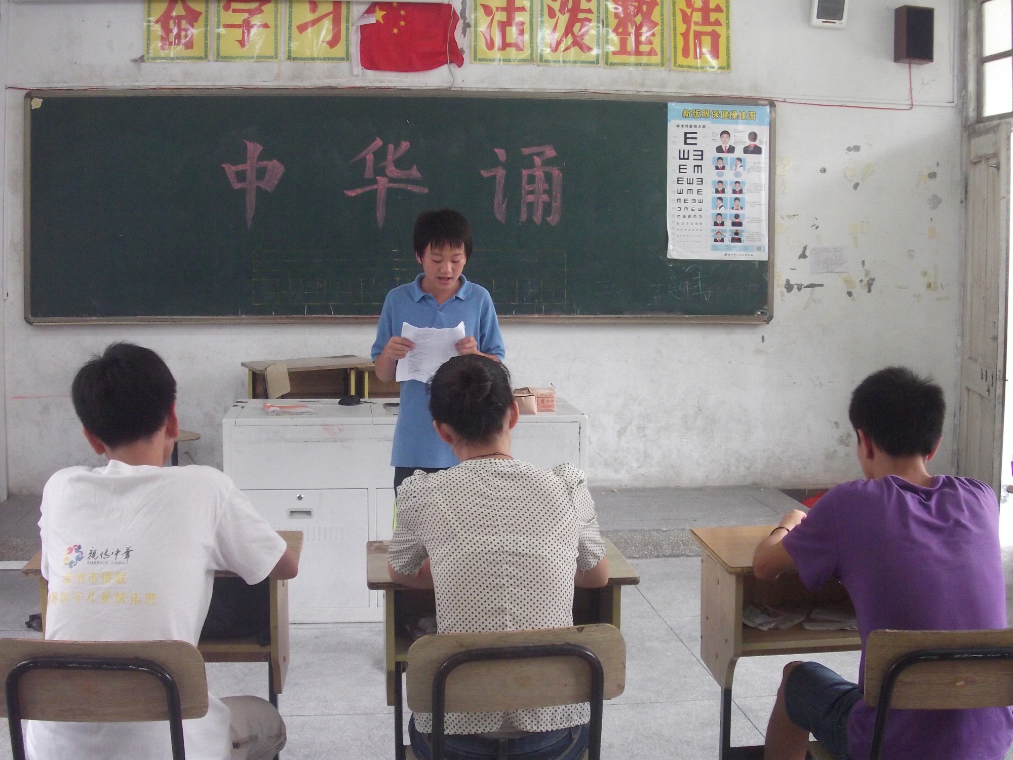 “我的祖国,高山巍峨,雄伟的山峰俯瞰历史的风狂雨落……” 一声声高昂的声音撞击着我们的耳膜,这也是本次比赛的一等奖获得者发自内心的呼喊。这四个可爱的小女生拥有天真活泼的喉咙,莫不是亲耳听到,我们定不会相信这样的爱国之情,这样的豪情壮语,竟是来自这些可爱烂漫的女孩。是她们让我们明白了何谓中华诵,亦是他们让我们领悟了爱国的豪情。即使许多实力很强的高年级同学都报名参加了朗诵比赛,低年级的同学们也不甘示弱:纷纷拿着自己的朗诵单子,一遍又一遍地朗诵着。虽然他们最后并没有取得像高年级的大哥哥大姐姐那样的好成绩,但他们用自己的努力向我们证明了中华诵是不分年龄,不分班级的,只要我们有着中国根,我们就要诵中华!在同学们的积极参与下,比赛圆满地结束了,产生了一等奖一名,二等奖两名,三等奖三名,以及鼓励奖若干名。