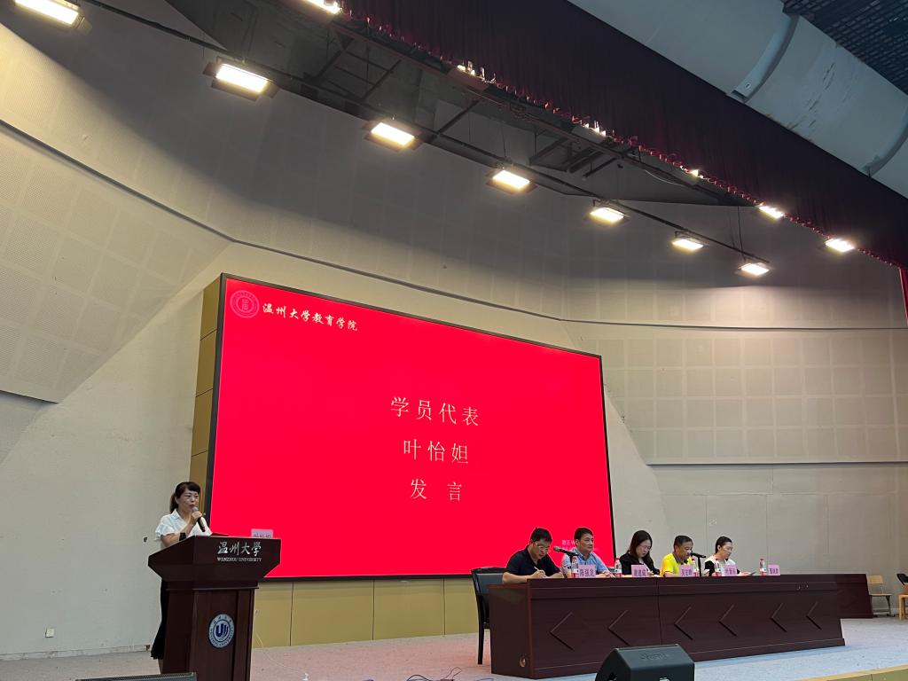 温州市瓯海区第二实验小学(原瓯海区外国语学校小学分校)叶怡妲校长作学员代表进行发言。作为一名教育管理者,做好学生教育的同时要认真对待学校管理工作,自己深知,任重道远!同时代表校长班学员表态:将以饱满的学习热情、认真的学习态度,脚踏实地、务实创新;以新知识武装自己,以新理念改变教育,真正做一名与时俱进的新时代校长。