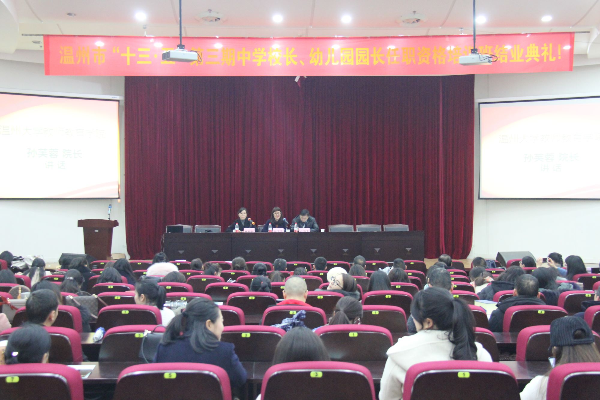 2019年1月15日下午,温州市“十三·五”第三期中学校长、幼儿园园长任职资格培训结业典礼在p站视频 学院路校区隆重举行。我院院长孙芙蓉、副院长叶新东出席本次典礼。典礼由我院继续教育科科长林鹣鹣老师主持。