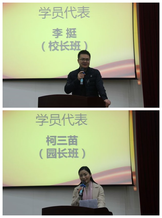 温州市绣山中学李挺副校长、温州第五幼儿园柯三苗副园长分别作为校长班和园长班的学员代表发言。