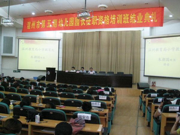 朱朝国处长和胡来林常务副院长在典礼上均做了精彩的讲话。朱处长在讲话中首先祝贺这期园长班学员顺利结业,对我院本次培训工作给予肯定并表示感谢。同时,也对学员提出了殷切的希望,希望各位园长回到工作岗位后,继续深入学习、落实教育发展规划纲要的精神,不断加强管理,努力提高师资队伍质量,办好幼儿园,为温州市学前教育做出贡献。