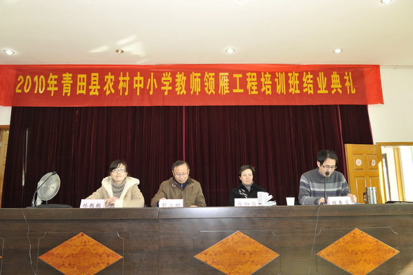 培训班结业典礼在青田县教育局的会议室举行,会场里洋溢着喜悦的氛围。青田县教育局党组成员、人事科蒋柳荫科长,我院彭小明副院长,继续教育科林鹣鹣副科长出席了典礼。结业典礼由青田县教师进修学校楼春富校长主持。
