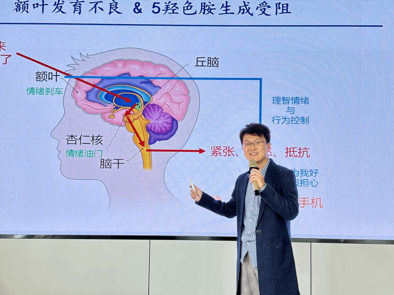 杜健博士以我们身边青少年手机沉迷险些造成悲剧的四个例子开场,紧接着引用最新国民调查报告,用图表清晰直观地展示了青少年手机沉迷的现状。之后,讲解了造成青少年手机依赖的多方面原因,包括其自身的身心发展特点、手机app厂商在游戏和软件中应用心理学原理对其的吸引,以及三种基本心理需要无法满足。其后,杜博士进一步讲解了手机沉迷的生理机制,包括本能脑、情感脑、思维脑,以及五种激素分泌的知识。随后,从生理、社交、心理、安全方面介绍了手机依赖的危害,加深了老师们对于这一问题行为的重视性。此外,杜博士还介绍了4种倾向和12条典型表现,帮助老师们判断青少年手机沉迷。最后,作为所有家长和老师最关心的一部分,杜老师给出了17条青少年手机沉迷的应对措施,以及一个系统的改变方案。