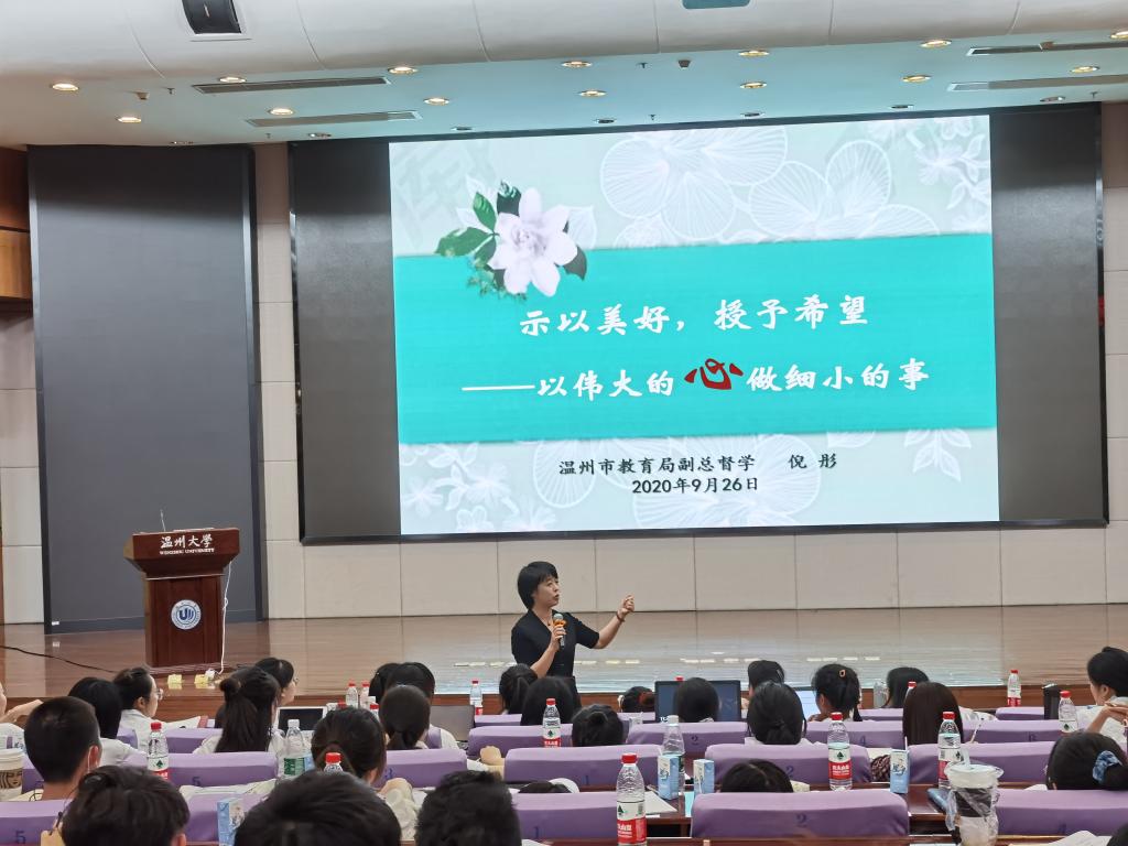 温州市教育局党委委员、专职副总督学倪彤老师以“以伟大的心做微小的事”为专题带领全体2020级新教师就教育这一话题在讲座中展开讨论。她从内在品得、班级管理、教学能力等各方面着手,利用生动的例子为新教师们梳理了一个“好老师”必备的专业素养,并鼓励新教师们在学习中增添教书的底气和实力。