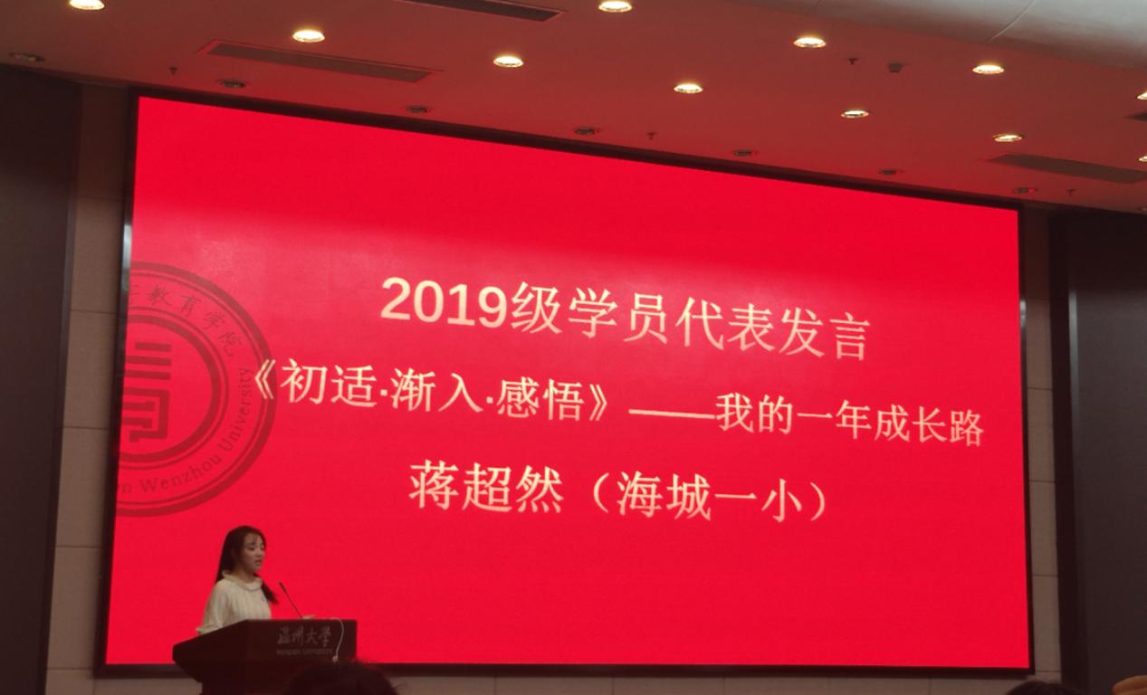 海城一小的蒋超然老师作为2019级新教师代表上台发言。她深情回顾了自己从教一年来“初适”“渐入”“感悟”的心路历程,并坚定地表明了未来不忘初心、砥砺前行的志愿。