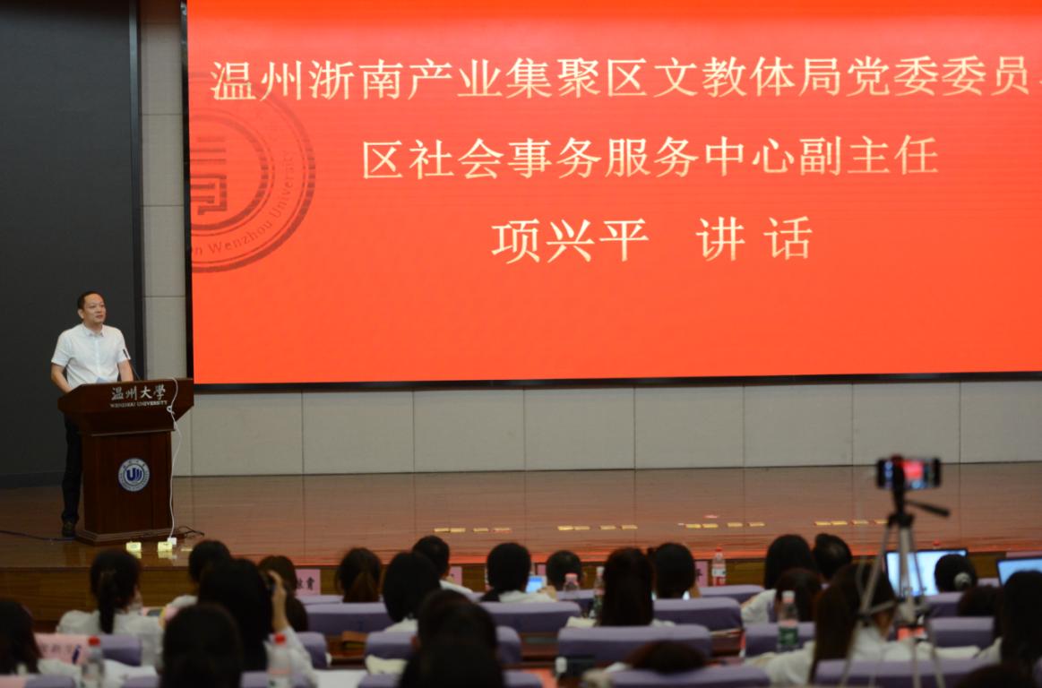 最后,区文教体局党委委员、区社会服务中心副主任项兴平同志就浙南产业集聚区教育工作的发展现状和未来前景展开一系列讲话,并对新教师提出了殷切期盼,“作为一名温州的人民教师,我们还要深入学习贯彻习近平总书记在浙江考察时的重要讲话精神,把伟大民族精神、时代精神熔铸于大美温州、流淌进温州人血脉,与时俱进传承好、弘扬好、践行好新时代温州人精神,干在实处、走在前列、勇立潮头,在新征程上奋力续写好新时代集聚区教育创新史。”同时,他希望新教师们始终牢记育人使命,始终葆有教育情怀,始终不忘教育初心,充满爱充满自信地为教育事业奉献力量,做合格的“四有”好老师,做集聚区教育追梦人!
