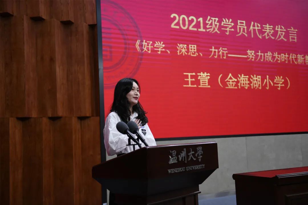 来自金海湖小学的王萱老师代表2021级新生做表态发言。面对日新月异的时代发展和教育需求的挑战,以“好学 深思 力行”的成长路径,努力做一名有目标感、责任感、积极感、学历感和专业感的“新”教师。