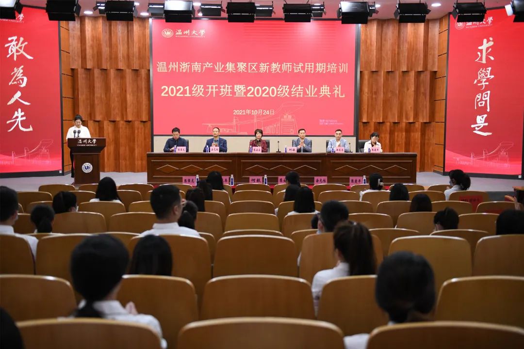 2021年10月24日,p站视频 岩松堂雁山厅迎来了温州浙南产业集聚区新教师试用期培训2021级开班暨2020级结业典礼。p站视频 何毅书记,区文教体局党委书记、局长陈云云,综合人事处、研训处、温大培训中心领导嘉宾及集聚区中小学、幼儿园162名学员共同出席了典礼。