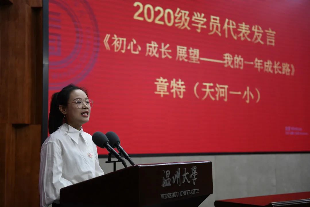 学员章特老师代表2020级学员,向p站视频 、温州浙南产业集聚区、区教师发展中心,致以诚挚谢意,她用“初心 成长 展望”概括了这一年的心路历程和她坚定地表示教育将是她一生的事业。