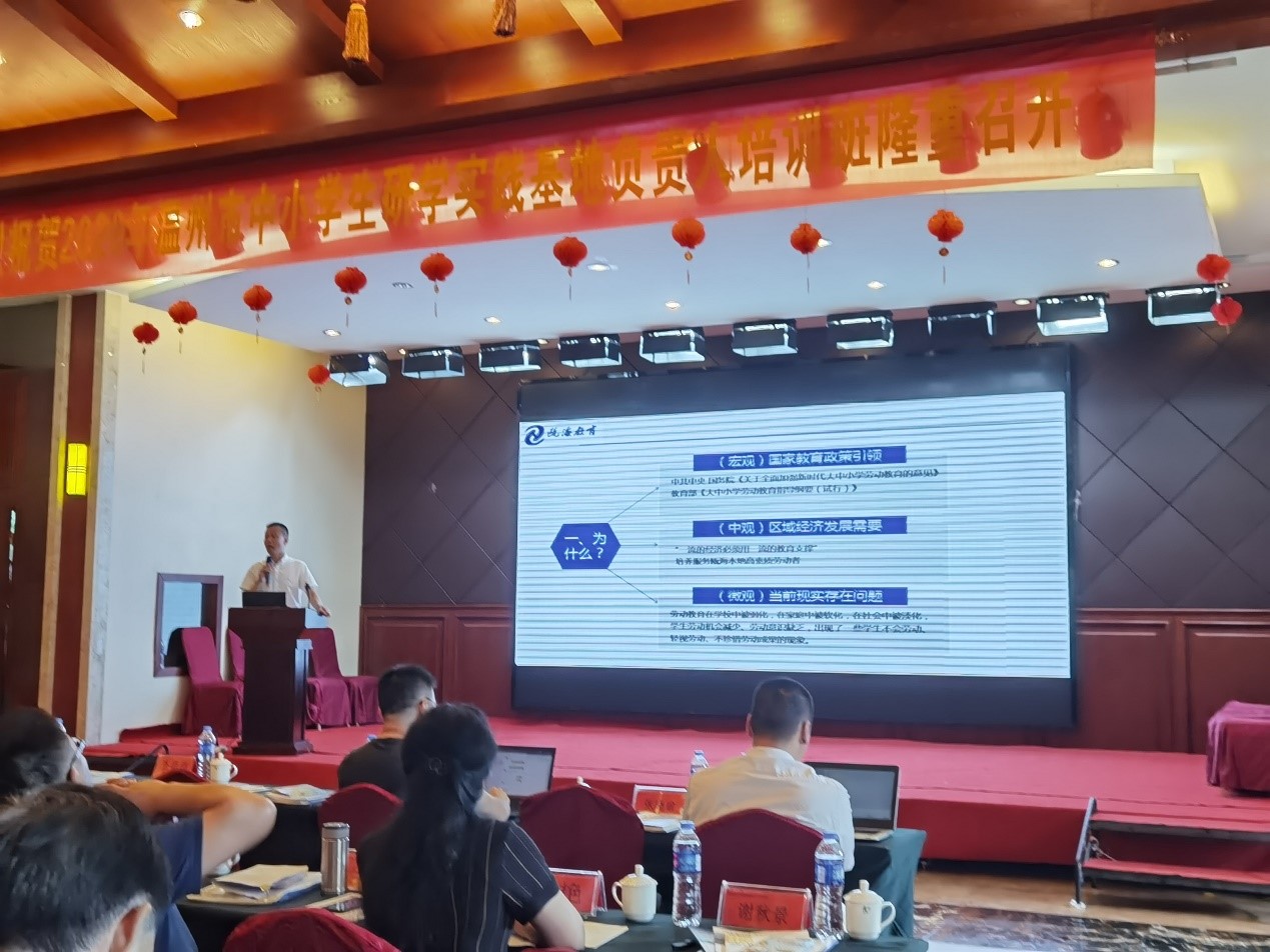 温州教育教学研究院教研员黄辉做“熔合劳动教育的研学旅行课程设计与开发”主题汇报。