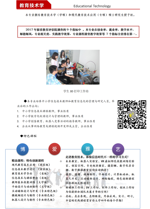 教育技术学专业为“十三五”浙江省一流专业、浙江省新兴特色专业和校重点专业。该专业在“重实践、强创新、能创业、懂管理、敢担当”的人才培养理念下,以培养具有“博爱雅艺”师范气质的数字化卓越教师为目标,深度对接教师教育质量标准与教育技术学专业教学质量标准,积极围绕人才培养与专业建设的重要环节和重点问题进行改革,形成“互联网+教育”的专业发展特色。同时,本专业积极探索本、硕、博一体化连贯式人才培养模式,从2007年开始招收并培养硕士研究生(学硕),2015年招收全日制与非全日制教育硕士研究生(专硕),2017年与韩国全南大学联合开展教育技术学博士培养,2018年获得教育技术学二级硕士点授予权。本专业现有教师17位,其中浙江省万人计划-教学名师1名、浙江省教坛新秀1名、浙江省151第二层次人才工程1名、浙江省之江青年社科学者1名、浙江省五星级青年教师1名、浙江省青年教师教学设计竞赛一等奖获得者1名,本专业教师84.6%有过海外或境外学习的经历,2009年被评为“浙江省教育技术优秀教学团队”,本专业同时还拥有一支数量充足结构合理的实验技术人员和教学辅助人员。随着全球国际化教育的升温,教育技术学专业通过教师海外进修、联合培养博士、本科交换生等多元化途径,在师资建设、学生发展等方面取得了丰富成果。目前,本专业师生在海外学习足迹已经遍布韩国国立全南大学,美国纽约州立大学奥斯威戈分校、日本广岛大学、台湾中华大学、台湾科技大学、香港大学、澳门城市大学等多所著名高校。