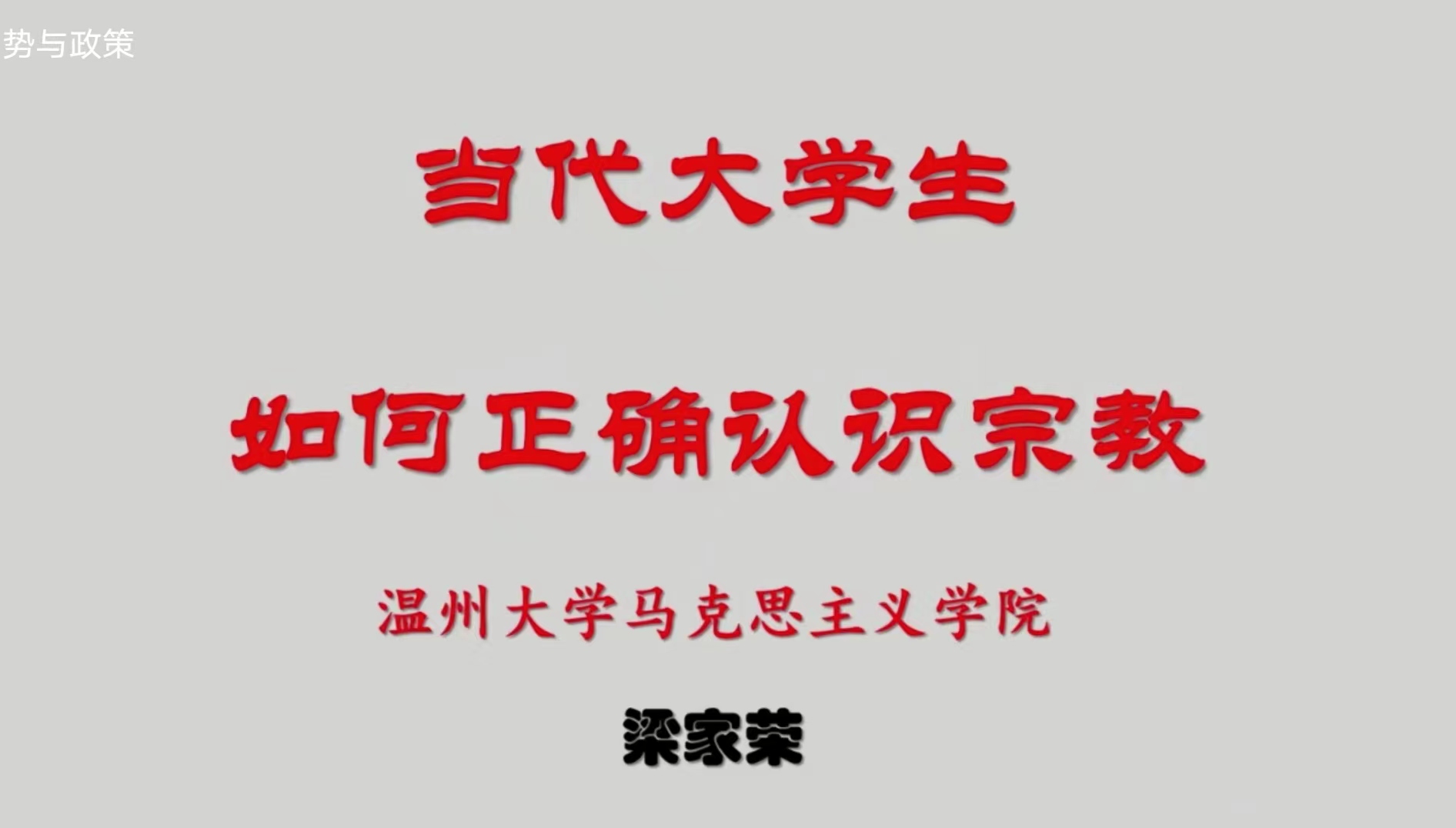 梁家荣老师从世界宗教概况出发,围绕马克思主义宗教观、党的基本宗教政策、宗教与教育等方面进行阐释和论述,坚持用马克思主义立场、观点、方法研究宗教问题。他结合《中华人民共和国宪法》《中华人民共和国教育法》《宗教事务条例》《普通高等学校学生管理规定》《p站视频 学生纪律处分规定》等,强调要全面贯彻党的宗教工作基本方针,坚持我国宗教的中国化方向,积极引导宗教与社会主义社会相适应。