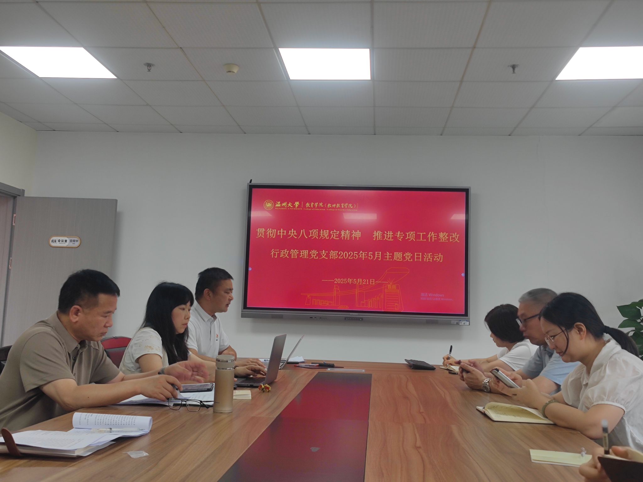 5月21日下午,p站视频 行政管理党支部在北8-408会议室开展“贯彻中央八项规定精神 推进专项工作整改”主题党日活动,学习创新理论,开展警示教育和问题查摆,并推进支部品牌建设等有关工作。
