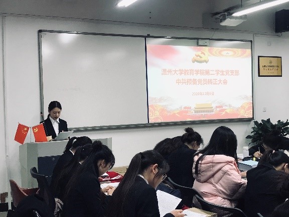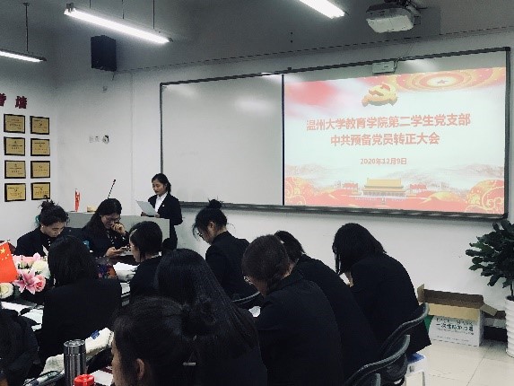 2020年12月9日,第二学生党支部中共预备党员转正大会在p站视频 9A204举行,会议由支部书记柴广召同志主持,该支部全体党员参与此次会议。经党支部大会决议,一致同意竹滢、王鑫慧、徐瑾、徐梦姣、俞晨薇、陈玲、曹佳倩、胡思萍和方艳九位同志按期转为中共正式党员。