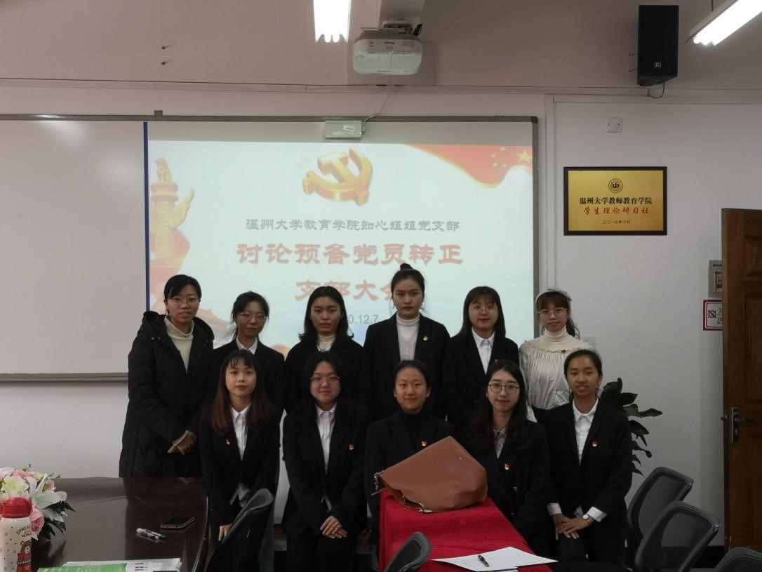 2020年12月7日,知心姐姐党支部中共预备党员转正大会在p站视频 9A204举行,会议由徐嘉浠同志主持,该支部全体党员参与此次会议。经党支部大会决议,一致同意周胜男同志按期转为中共正式党员。