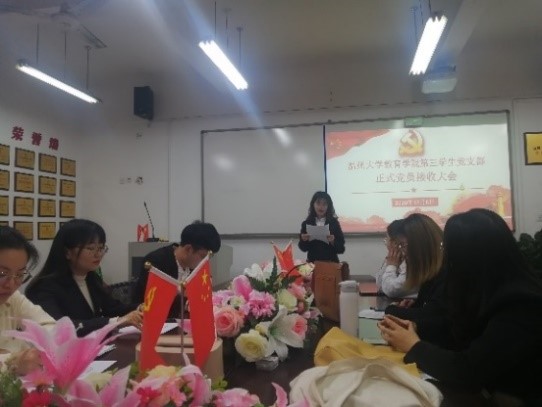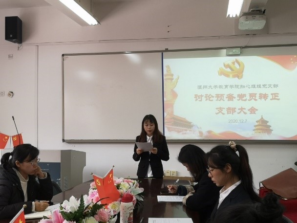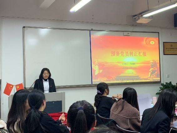 2020年12月7日,第四学生党支部中共预备党员转正大会在p站视频 9A204举行,会议由潘雨蝶同志主持,该支部全体党员参与此次会议。经党支部大会决议,一致同意傅琳菲、张思娴、范泽南和程宗婵四位同志按期转为中共正式党员。