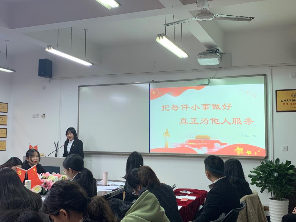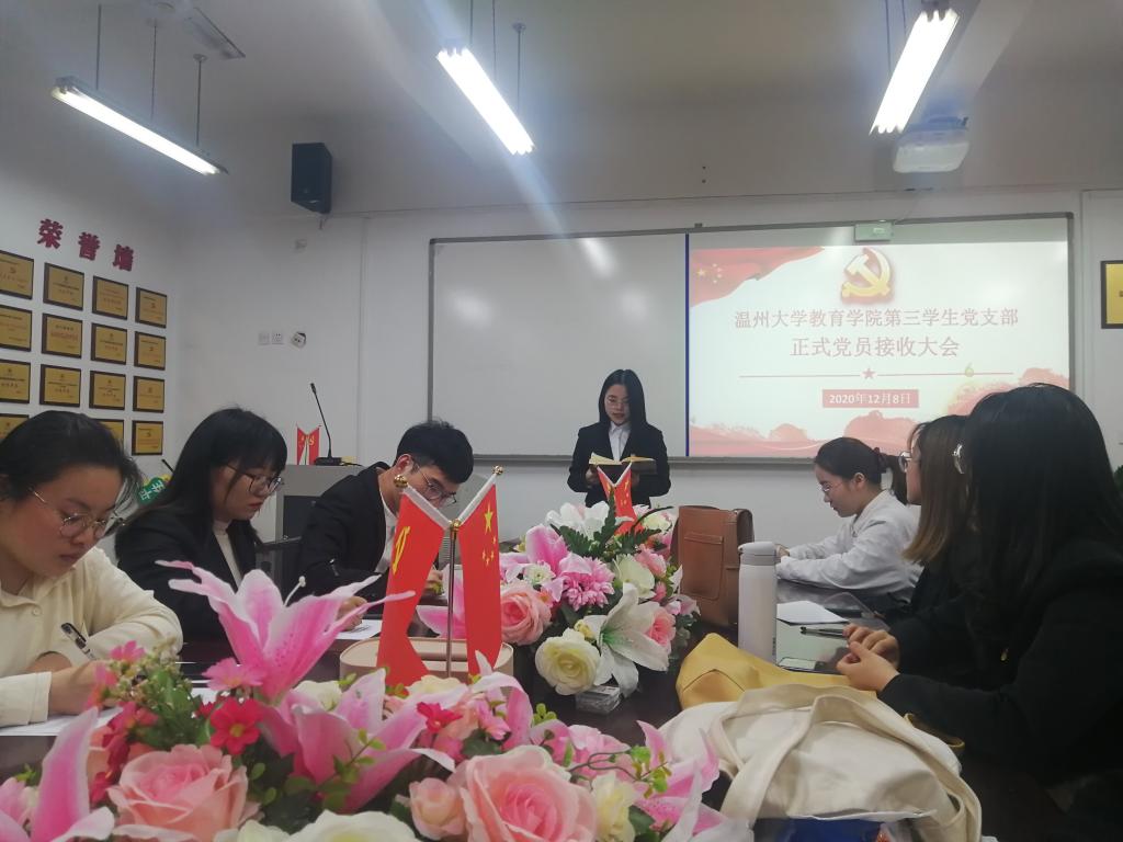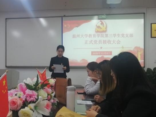 2020年12月8日,第三学生党支部中共预备党员转正大会在p站视频 9A204举行,会议由党支部书记何奔奔同志主持,该支部全体党员参与此次会议。经党支部大会决议,一致同意杨佳检、洪蒋禧、林纯、陈渝渝和周金瑜五位同志按期转为中共正式党员。