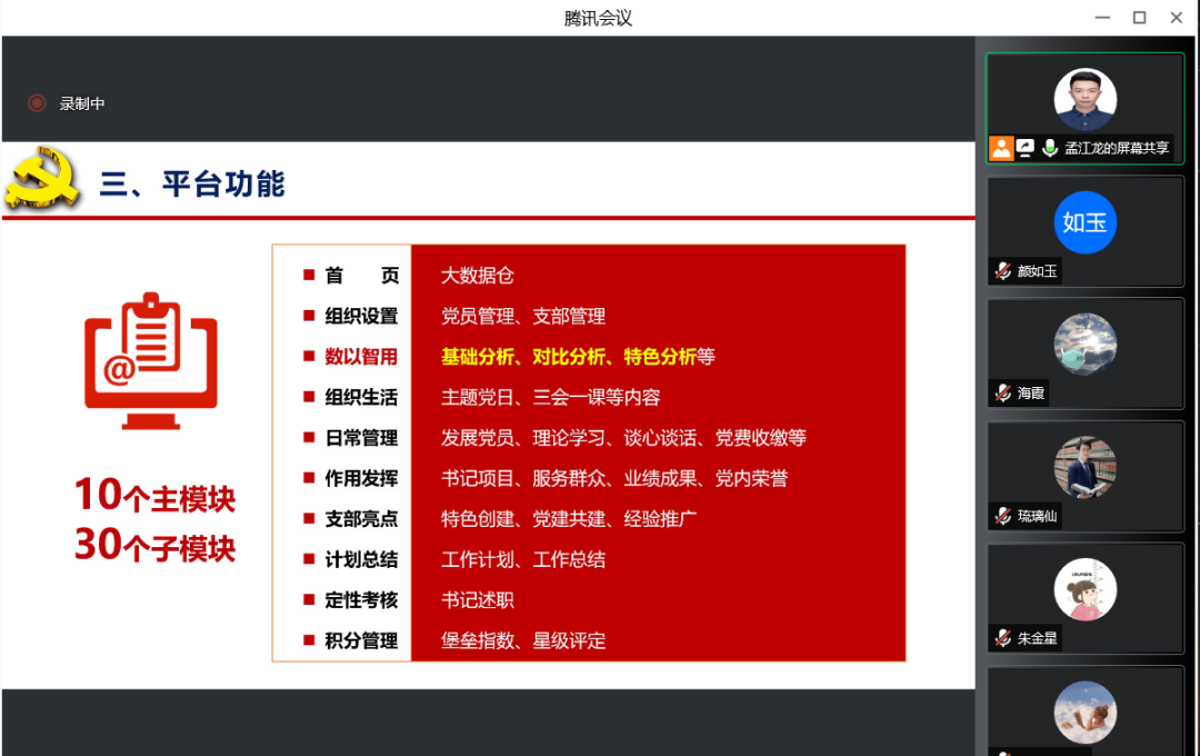 p站视频 党支部数字化管理平台于1月5日正式上线,该平台是p站视频 自主研发、拥有独立版权的智慧党建系统,拥有电脑端管理系统和手机端用户APP两种模式,采用学校党委、二级党组织、党支部、党员四级管理体制,我院党委作为试点单位之一。因党支部增设和人事变动,4月7日中午,我院于腾讯会议平台线上召开p站视频 党支部数字化管理平台使用推进会暨培训交流会,学院党委副书记兼纪委书记彭小媚、19个师生党支部的党支部书记及党支部委员、党务秘书孟江龙参加了会议。