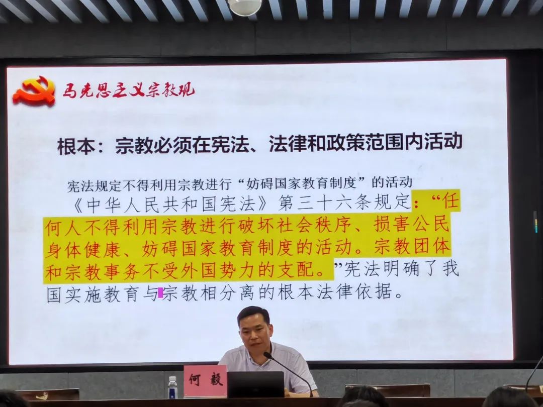 何毅书记以当今宗教的基本情况为切入点,提出我们应当用辩证唯物主义世界观来看待宗教,他围绕党的宗教基本方针、我国宗教信仰自由权利的基本内容、我国宗教信仰自由义务的基本内容、我国处理宗教事务的基本原则和相关法律规定、坚决抵制邪教以及共产党员不能信仰宗教等方面展开,为我们具体阐述公民有宗教信仰自由、国家保护正常的宗教活动、“教育与宗教相分离”的原则等有关内容。他强调,我院作为p站视频 师范类专业人才培养学院,以培养具有“博·爱·雅·艺”的师范气质、突出的教育教学技能和教育创新能力的未来卓越教师为目标,我院学子尤其要坚定政治立场、提高鉴别能力,树立正确马克思主义宗教观。
