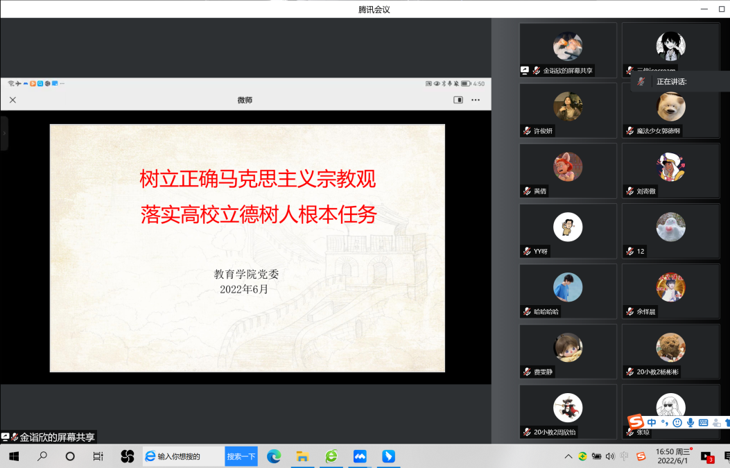 《形势与政策》课是高校学生思想政治教育的重要内容,是高校思想政治理论课的重要组成,是帮助大学生正确认识新时代国内外形势,深刻领会党和国家事业取得的历史性成就、发生的历史性变革、面临的历史性机遇和挑战的核心课程。2022年6月1日下午,我院采用线上和线下结合的形式开展《树立正确马克思主义宗教观 落实高校立德树人根本任务》讲座,学院党委书记何毅担任本次课程主讲人。学院党委副书记章园园、学工办辅导员孟江龙一同听讲了本场报告。